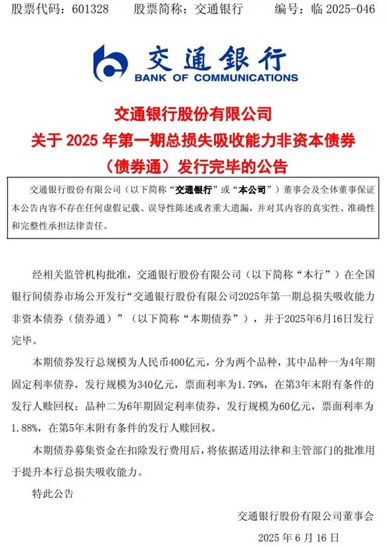 据交通银行公告,本期TLAC债券发行总规模为人民币400亿元,分为两个品种,其中品种一为4年期固定利率债券,发行规模为340亿元,票面利率为1.79%,在第3年末附有条件的发行人赎回权;品种二为6年期固定利率债券,发行规模为60亿元,票面利率为1.88%,在第5年末附有条件的发行人赎回权。